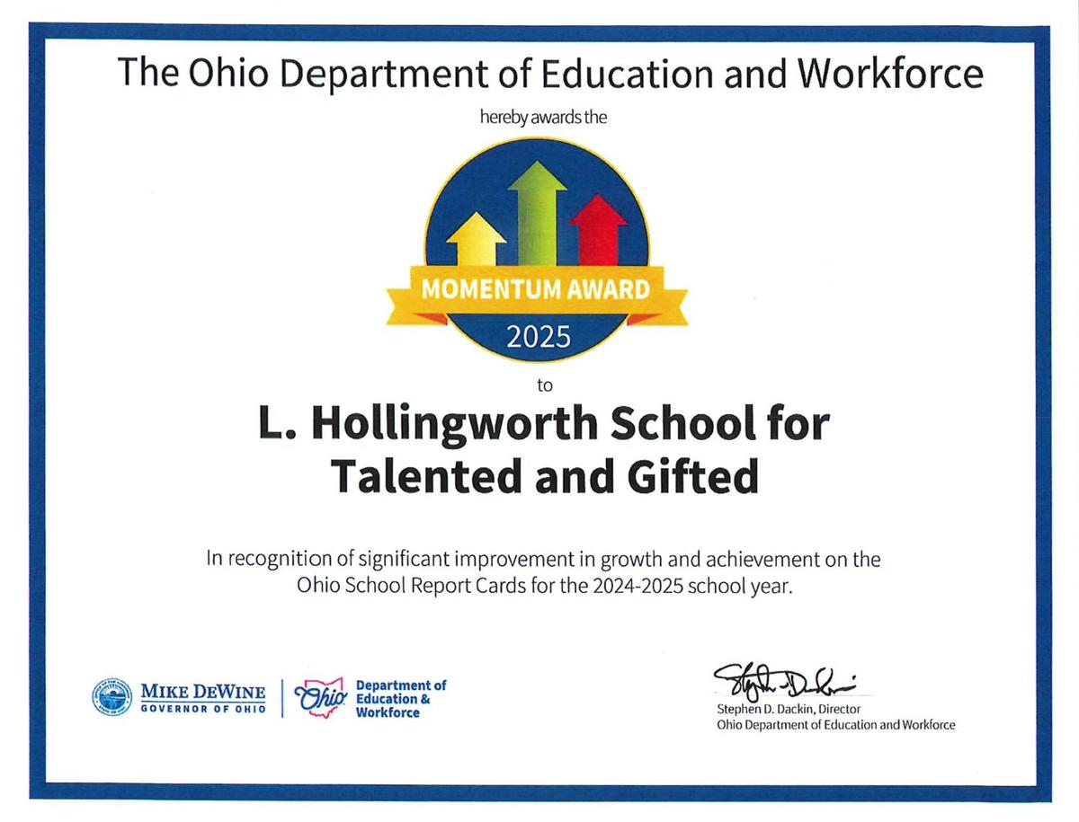L. Hollingworth School is proud to announce that we have been recognized by the Ohio Department of Education and Workforce with the Momentum Award for our results on the 2024–2025 Ohio School Report Card.